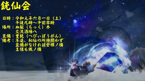 ゲーム内イベント 「着物に憧れて」(~6/12)NEW! 「ミズキの表彰会」(~6/19) 「ミズキと手練のハンター」(~6/12) 「憧れの翼…」(~6/5) 「黒き太刀を携えし者」(~6/12)NEW! 今週のお得クエスト ユーザーイベント 銃仙会(6/8) 2019年 第2…